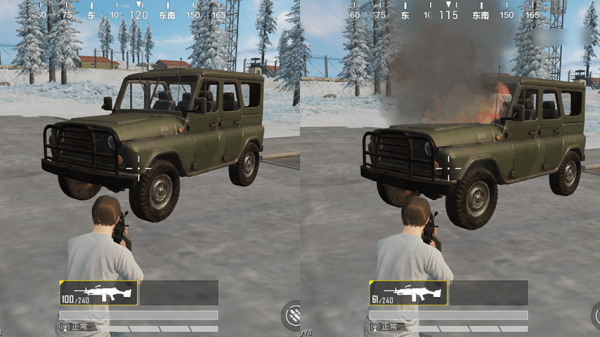 M249最厉害的一点在于扫车无敌,载具在游戏中是长距离转移地点十分重要的道具, 但车也有一点弊端就是当耐久度到0时就会爆炸,爆炸时车内的人也会被淘汰。对手也无法在高速行驶跳车,不然就会直接倒地。如下图所见,M249只需要五十颗子弹就能将一辆100%耐久度的车打爆,即使在开枪时因为后坐力的原因导致有一些子弹偏移没有打在车上,但100车上发的弹容量也足够将车打爆。其它枪支起码需要换弹两次才能抵得上M249扫车时的输出。