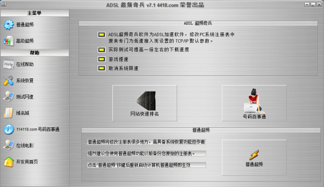 ADSL超频奇兵是款特别实用的ADSL超频工具软件,该软件可以修改注册表种原来专为低速连接而设定的TCP/IP默认设置主要参数,以融入PPPOE方式的ADSL接入,而且可以合理提高你的互联网速率,让你拥有更强的网上感受,喜欢的用户快来下载吧。