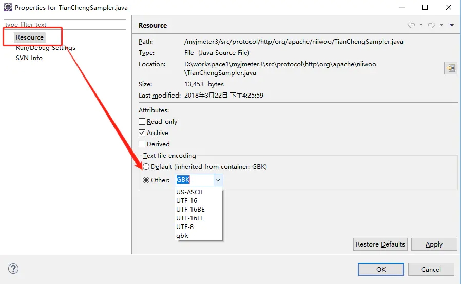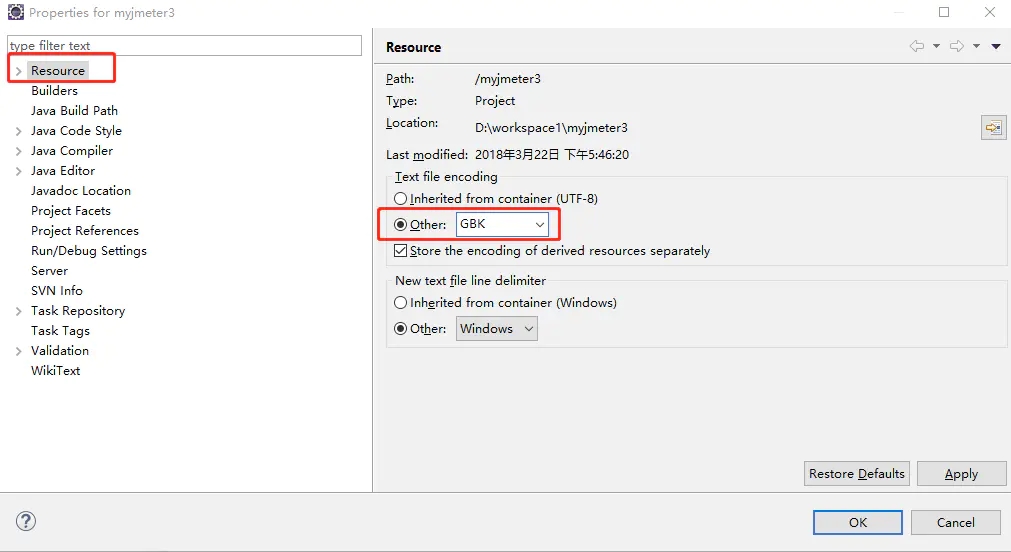 在打开的新窗口左边的菜单树中选择 Resource(即第一个),然后在右面找到 Text file encoding ,选择 “other”,在下拉框中选择需要的编码方式。