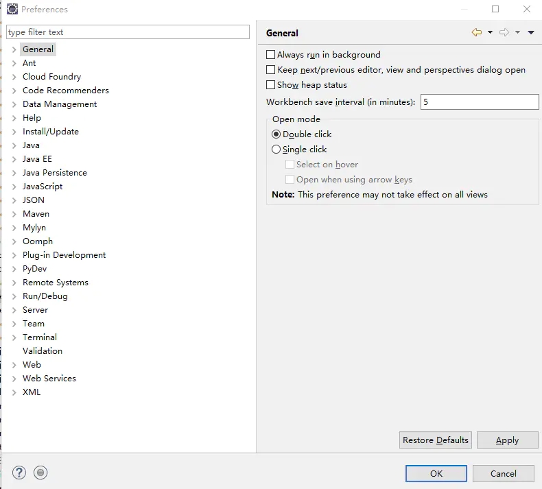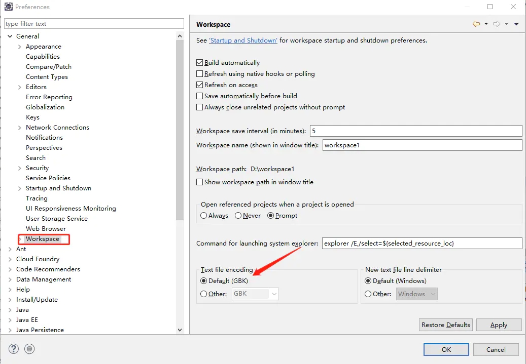 进入general的选项,选中workspace的选项,点击Apply,点击OK退出。