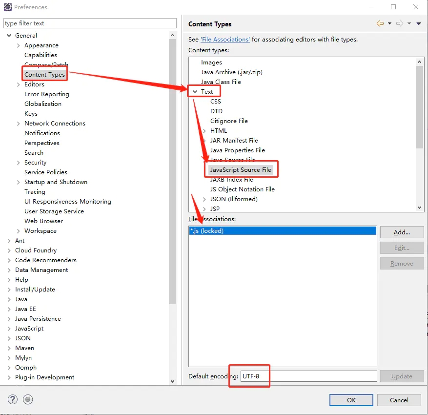 假设要将js文件编码方式设为UTF-8,则应该 Window->General->Content Types 在Content Types中选择JavaScript Source File,在File associations栏中选中*.js,然后在Default Encoding栏中输入UTF-8,单击Update,保存即可。